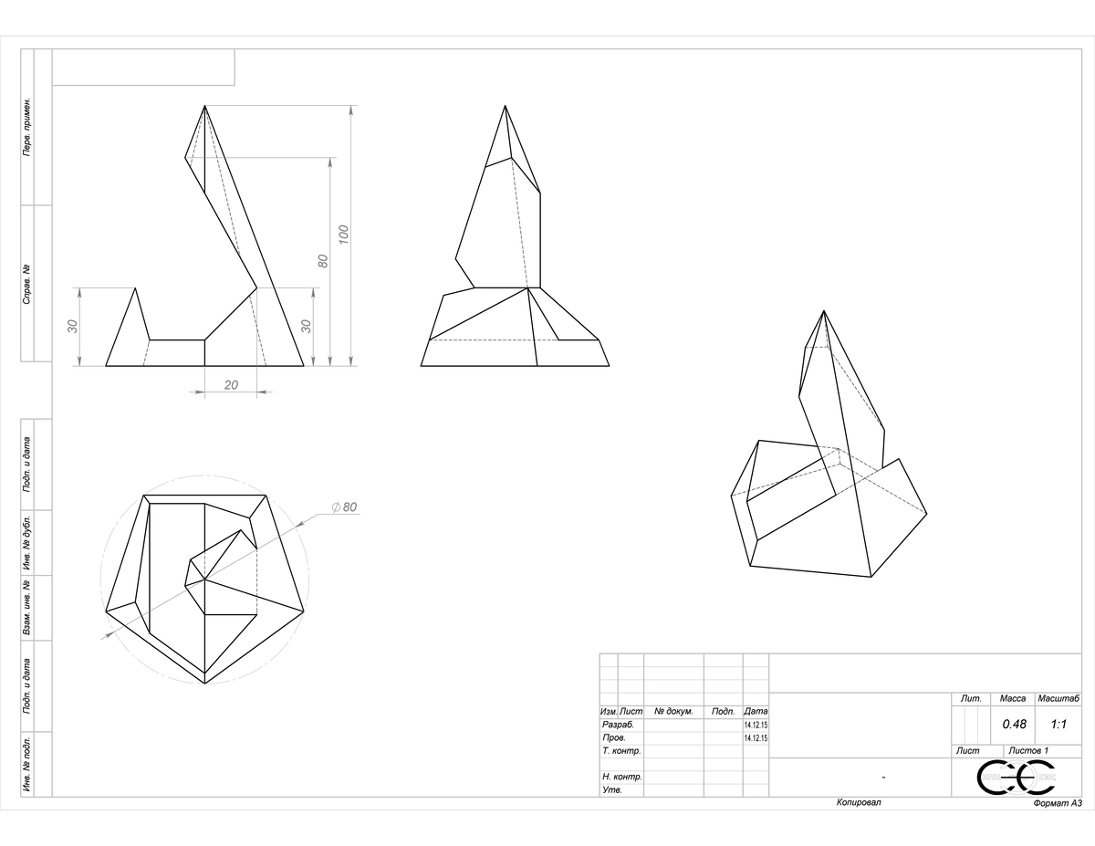 Три стандартных вида и изометрия на картинке в приложении к ответу.